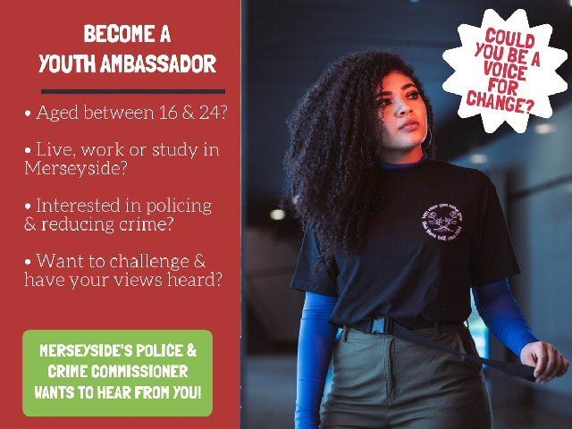 The role will last for 12 months and is open to those aged between 16 and 24, who live, work or study in Merseyside. Youth Ambassadors will meet bi-monthly with the Police Commissioner and her team and will assist in the creation and delivery of a new Youth Engagement Plan, which they will help to share with other young people by visiting schools, youth clubs and community groups across Merseyside. They will also be expected to attend youth engagement events, inform campaigns aimed at young people and review the services offered to their peers.