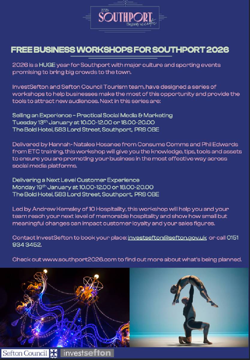InvestSefton in partnership with Sefton Council's Tourism team are offering your business spaces on expert led workshops focusing on:- Social Media and Sales, along with:- Hospitality Customer Service training; delivered by industry experts to help you improve your social media, increase sales and improve customer experience, ensuring customers come back again and again.....