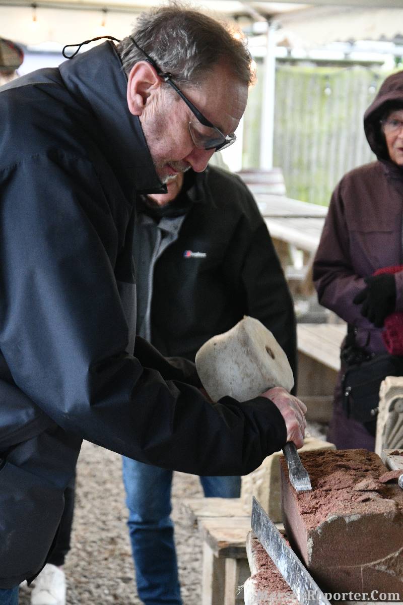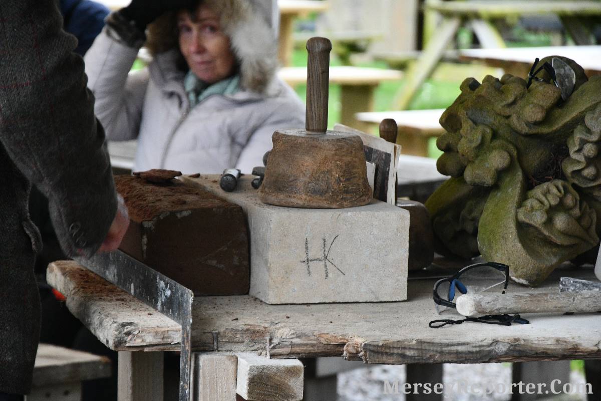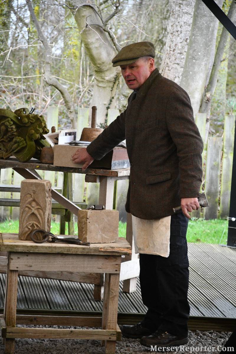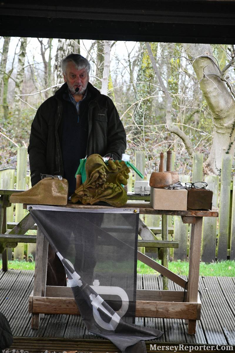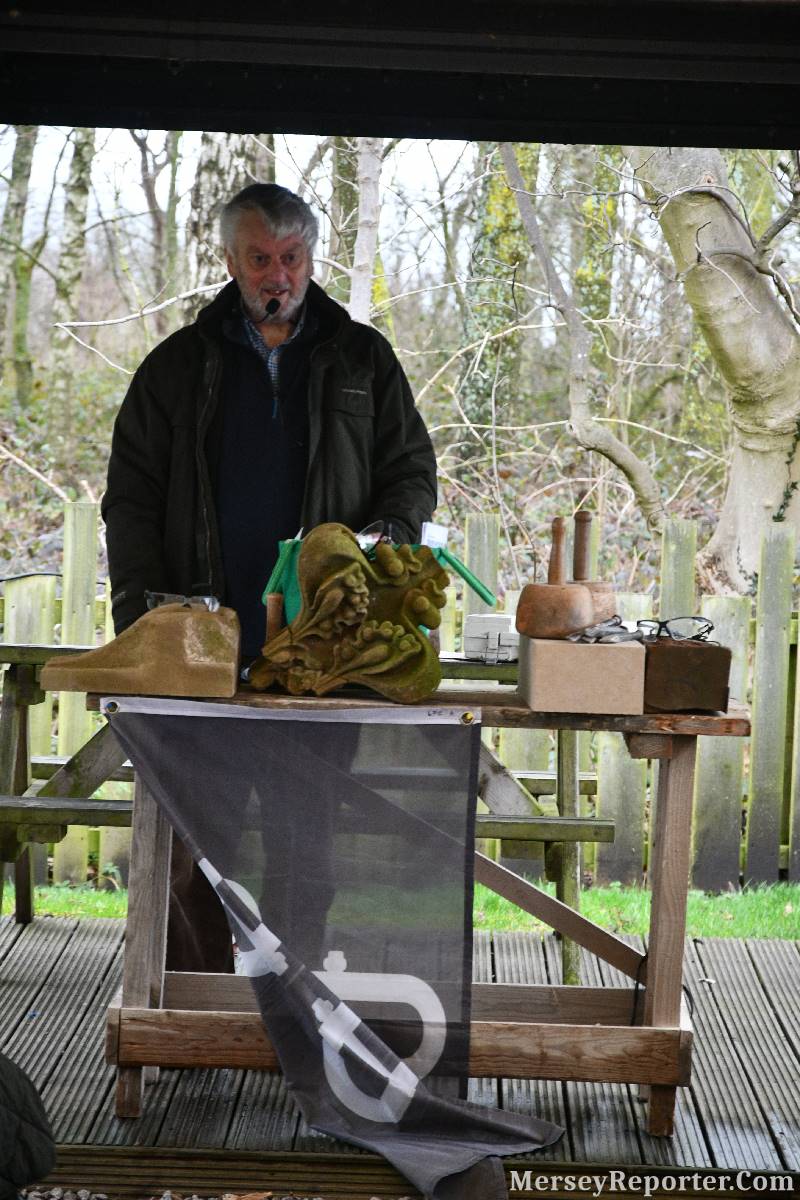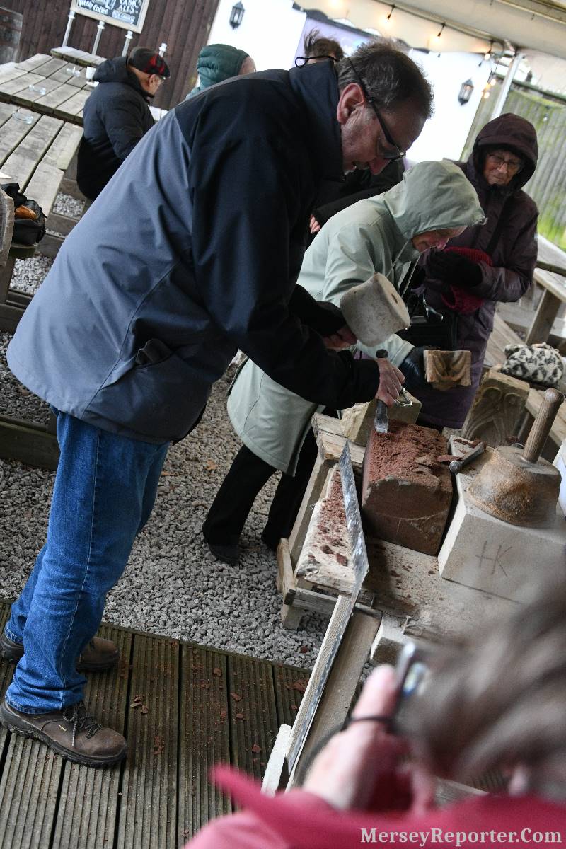 Under the awning provided by the Scotch Piper, there were photos and literature, alongside artefacts, but the foul weather deterred much perusal. After the information was delivered the group was privileged to hear a talk given by an Ex Mayor of Magull, Ken Hughes, who is a qualified and very experienced stonemason, who has worked on many historical buildings, including:- Fountain's Abbey, and Liverpool Cathedral. He talked animatedly about his apprenticeship and methods of learning his art. He also demonstrative his skills carving a sandstone block. His talk and demonstration were both informative and amusing. He even allowed attendees the chance to have a go at carving a block of stone, which only highlighted just how much skill is required to make any impact! It must be inspiring to realise that the work you have completed and bears your mark (every stone mason has his own individual mark) will probably survive for hundreds, maybe thousands of years.