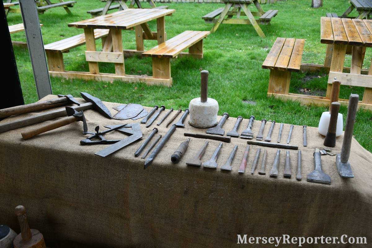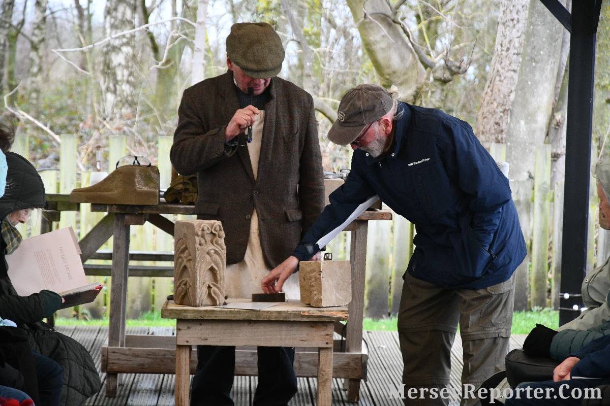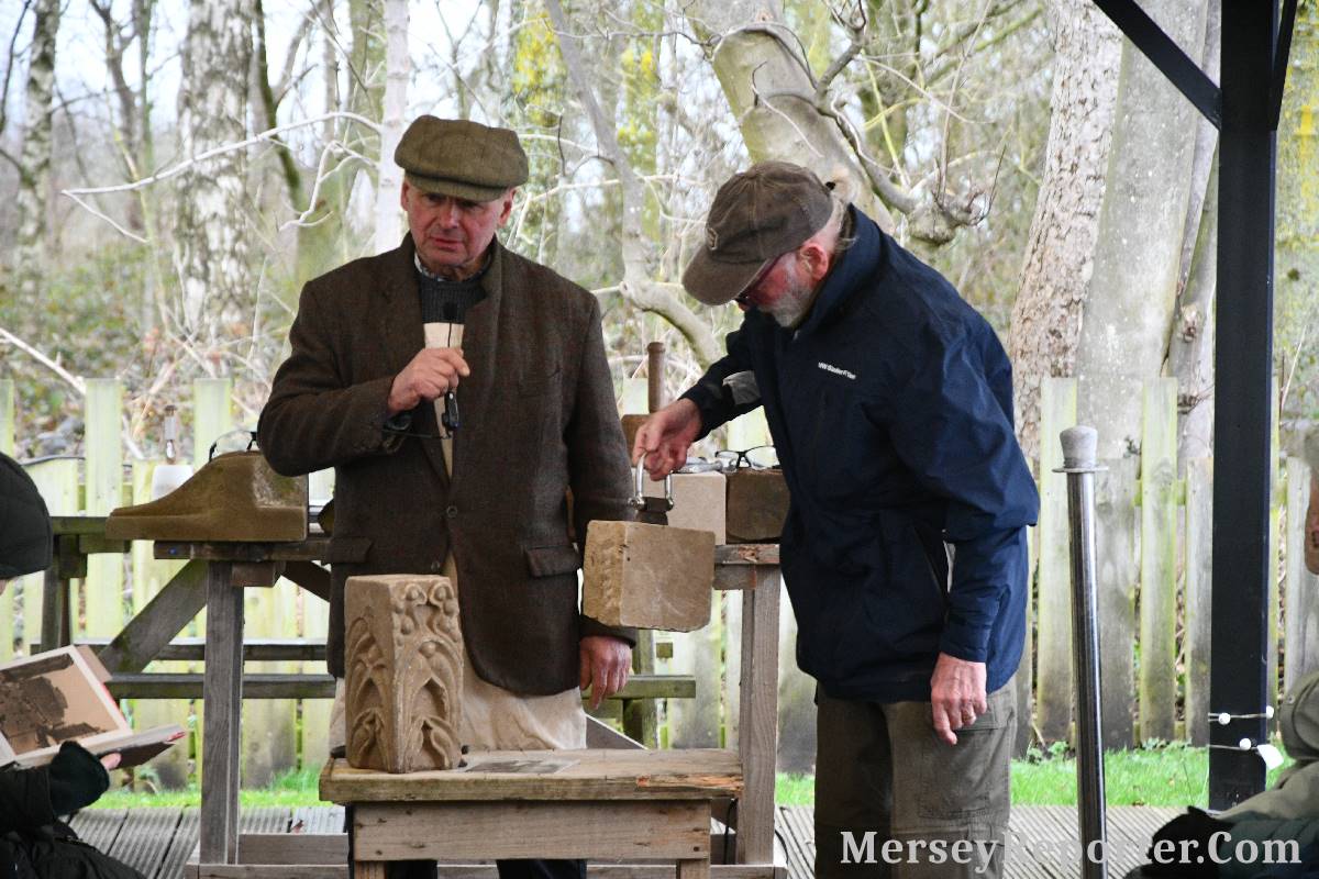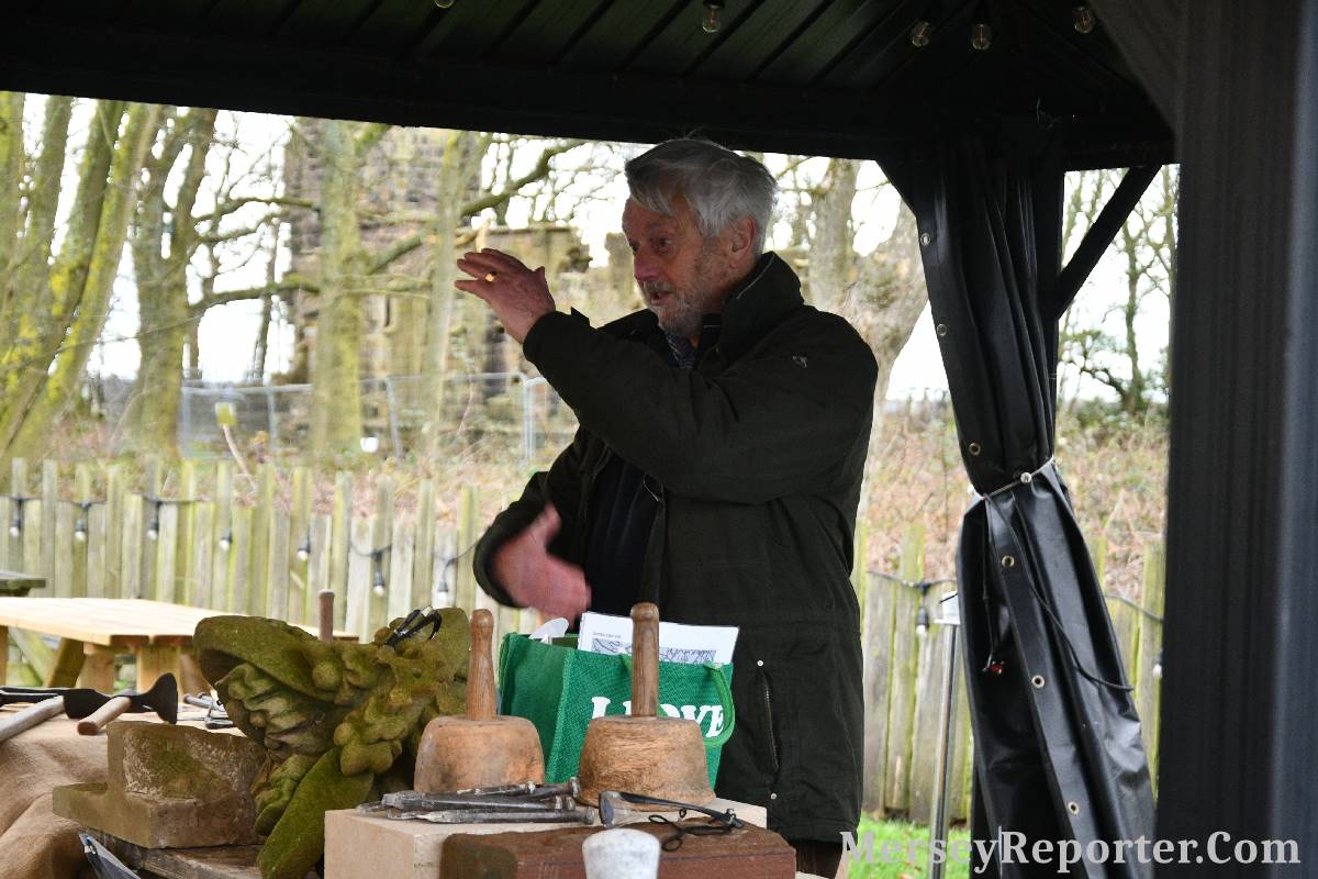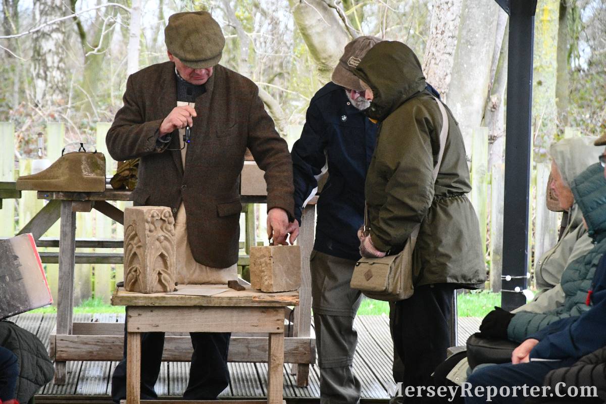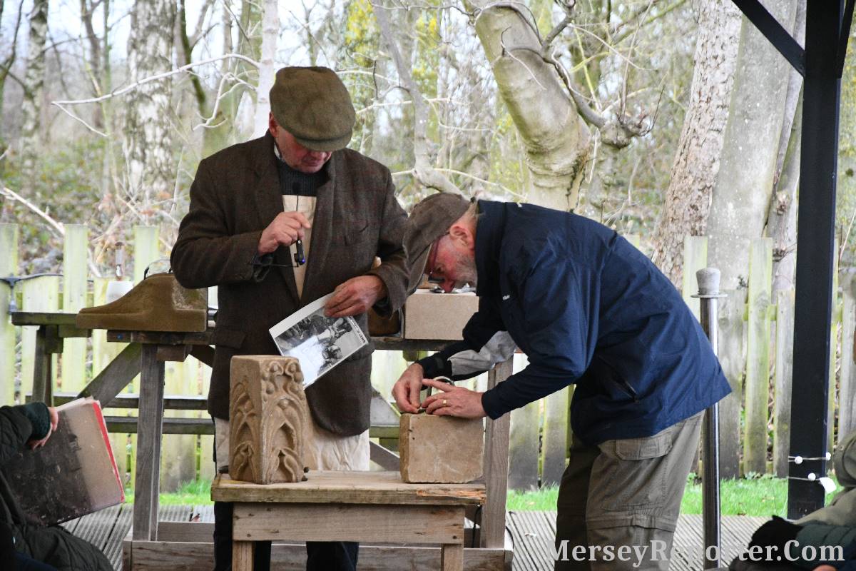 Under the awning provided by the Scotch Piper, there were photos and literature, alongside artefacts, but the foul weather deterred much perusal. After the information was delivered the group was privileged to hear a talk given by an Ex Mayor of Magull, Ken Hughes, who is a qualified and very experienced stonemason, who has worked on many historical buildings, including:- Fountain's Abbey, and Liverpool Cathedral. He talked animatedly about his apprenticeship and methods of learning his art. He also demonstrative his skills carving a sandstone block. His talk and demonstration were both informative and amusing. He even allowed attendees the chance to have a go at carving a block of stone, which only highlighted just how much skill is required to make any impact! It must be inspiring to realise that the work you have completed and bears your mark (every stone mason has his own individual mark) will probably survive for hundreds, maybe thousands of years.
