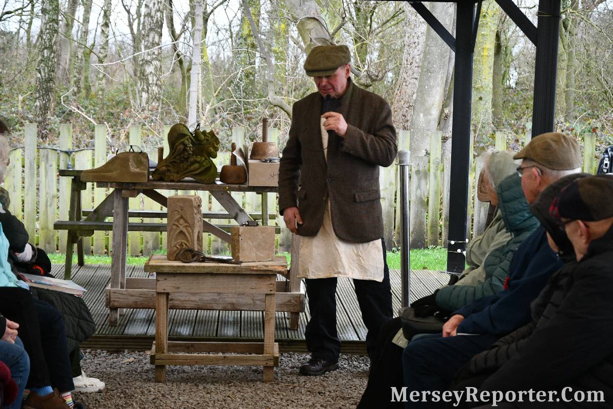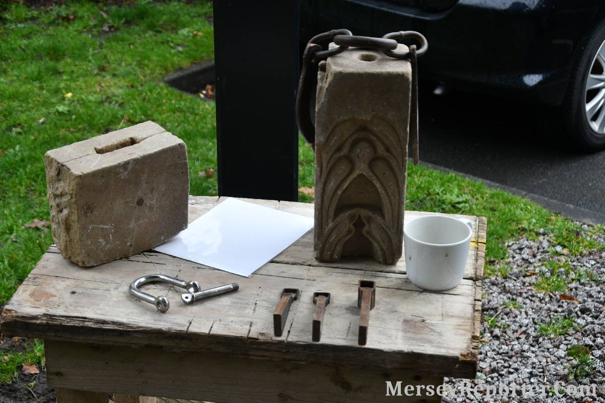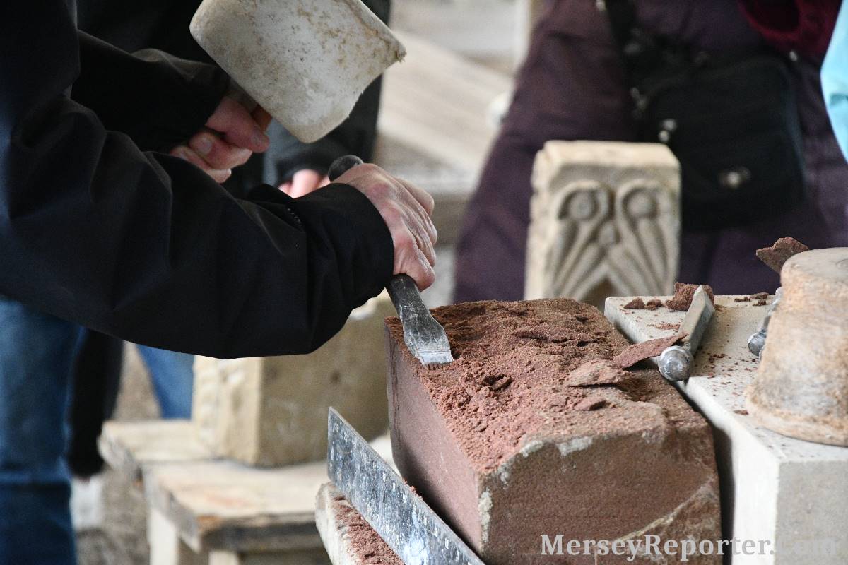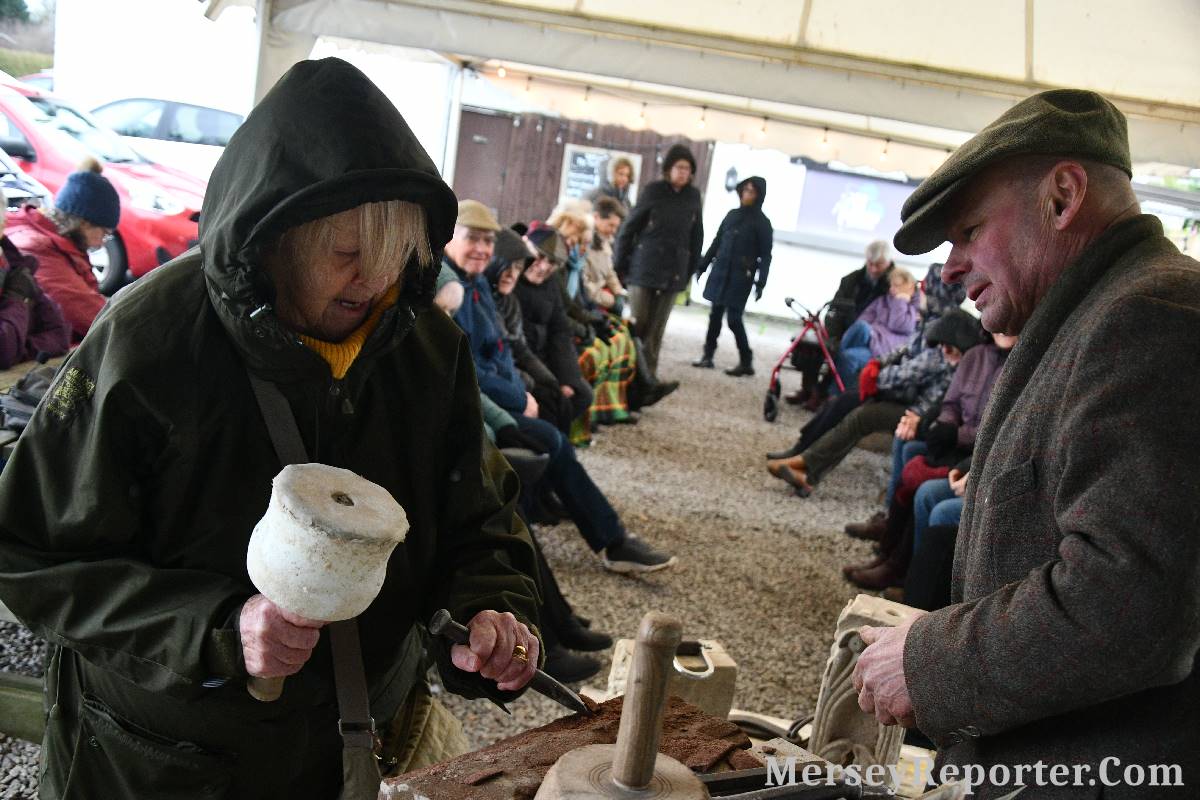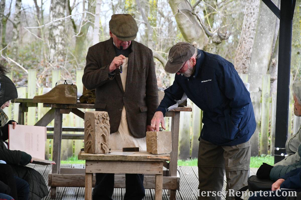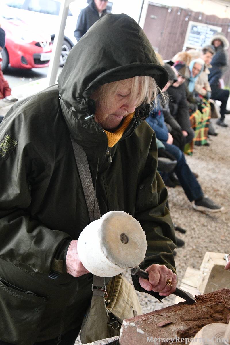Under the awning provided by the Scotch Piper, there were photos and literature, alongside artefacts, but the foul weather deterred much perusal. After the information was delivered the group was privileged to hear a talk given by an Ex Mayor of Magull, Ken Hughes, who is a qualified and very experienced stonemason, who has worked on many historical buildings, including:- Fountain's Abbey, and Liverpool Cathedral. He talked animatedly about his apprenticeship and methods of learning his art. He also demonstrative his skills carving a sandstone block. His talk and demonstration were both informative and amusing. He even allowed attendees the chance to have a go at carving a block of stone, which only highlighted just how much skill is required to make any impact! It must be inspiring to realise that the work you have completed and bears your mark (every stone mason has his own individual mark) will probably survive for hundreds, maybe thousands of years.