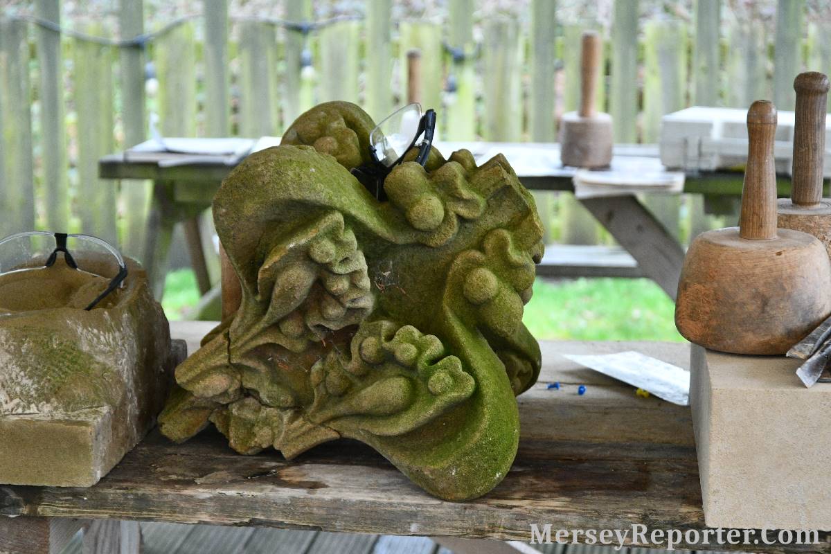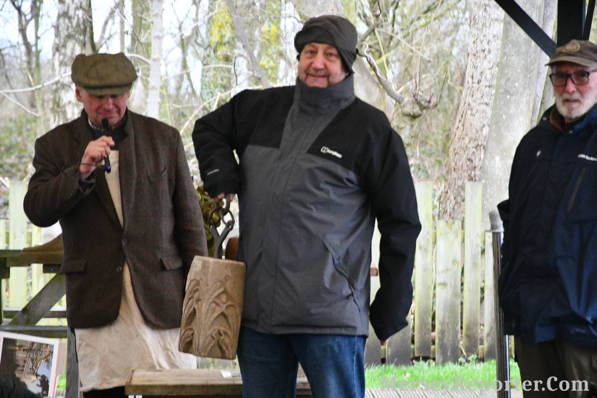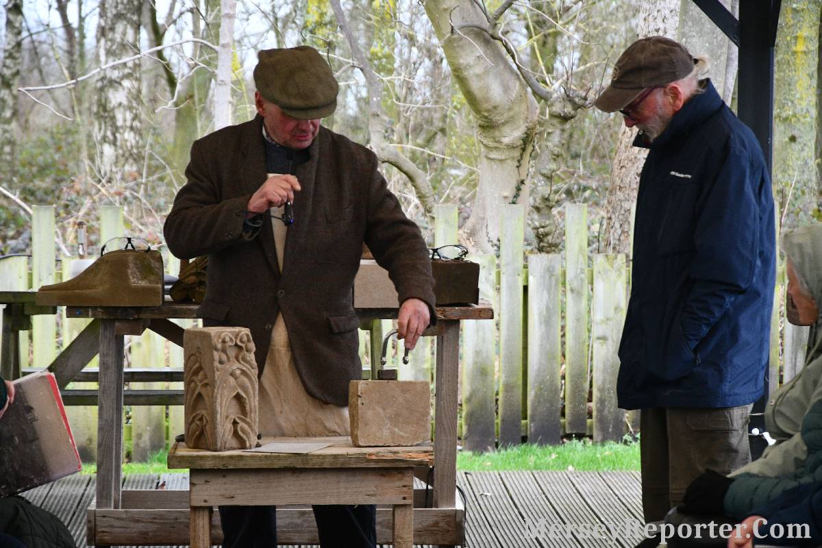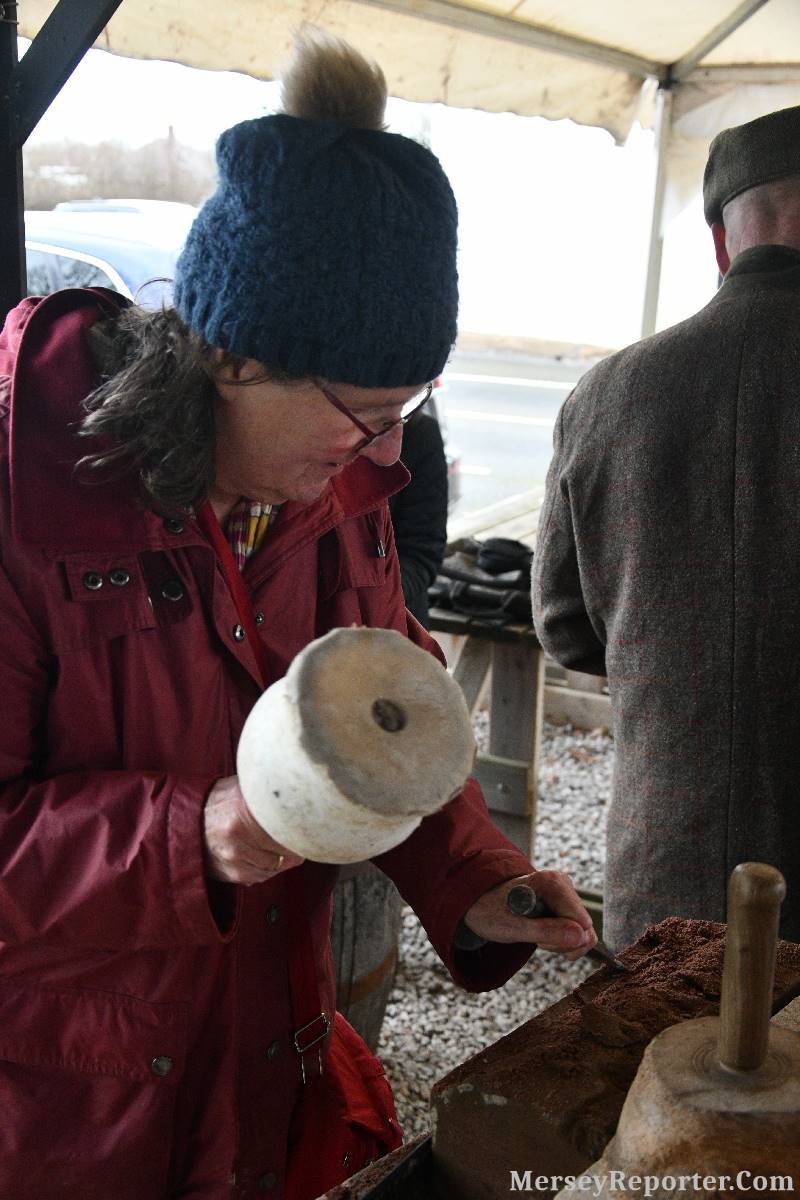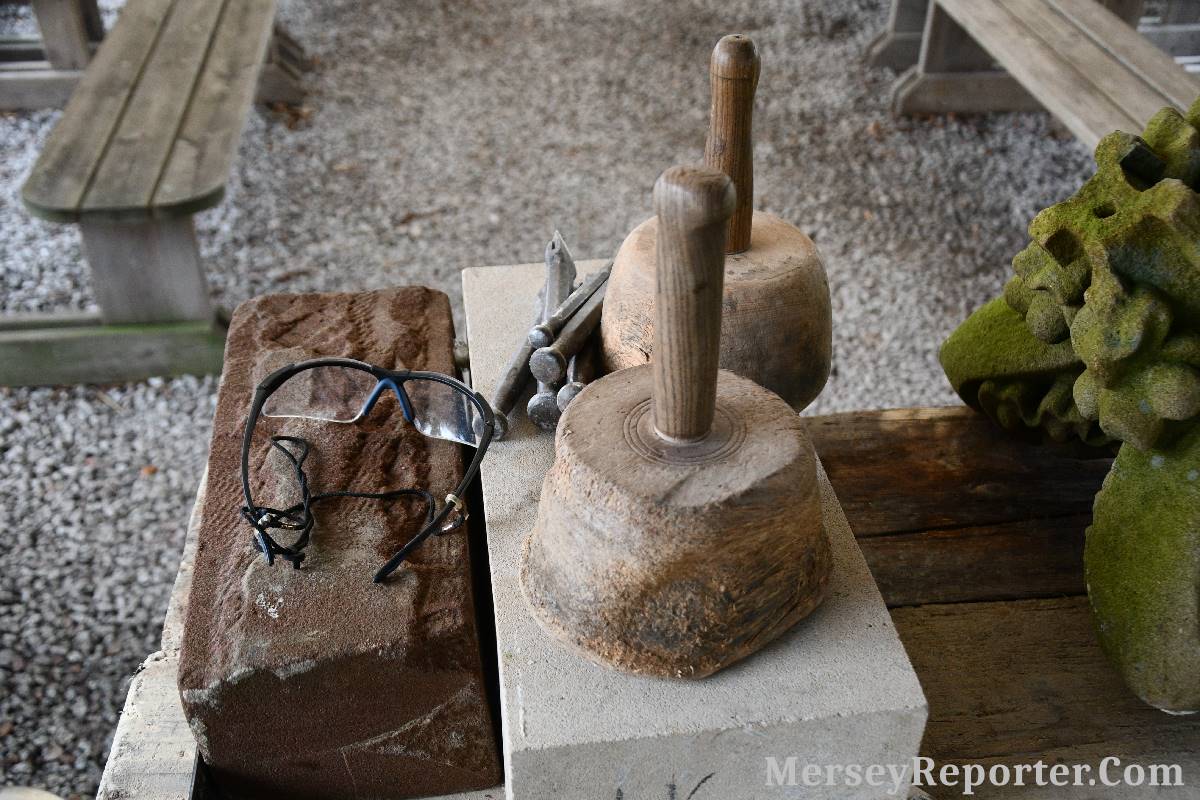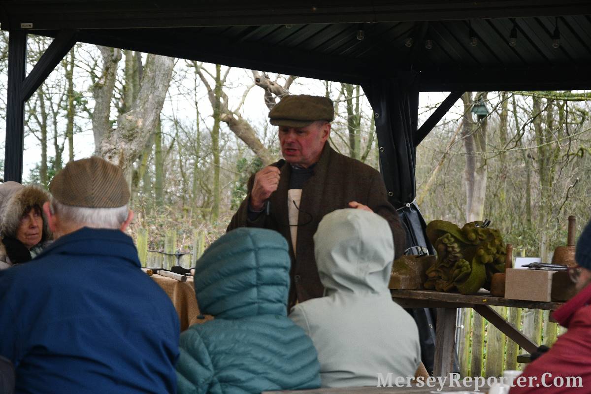 Under the awning provided by the Scotch Piper, there were photos and literature, alongside artefacts, but the foul weather deterred much perusal. After the information was delivered the group was privileged to hear a talk given by an Ex Mayor of Magull, Ken Hughes, who is a qualified and very experienced stonemason, who has worked on many historical buildings, including:- Fountain's Abbey, and Liverpool Cathedral. He talked animatedly about his apprenticeship and methods of learning his art. He also demonstrative his skills carving a sandstone block. His talk and demonstration were both informative and amusing. He even allowed attendees the chance to have a go at carving a block of stone, which only highlighted just how much skill is required to make any impact! It must be inspiring to realise that the work you have completed and bears your mark (every stone mason has his own individual mark) will probably survive for hundreds, maybe thousands of years.