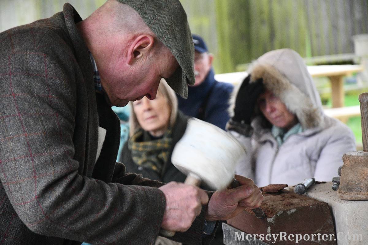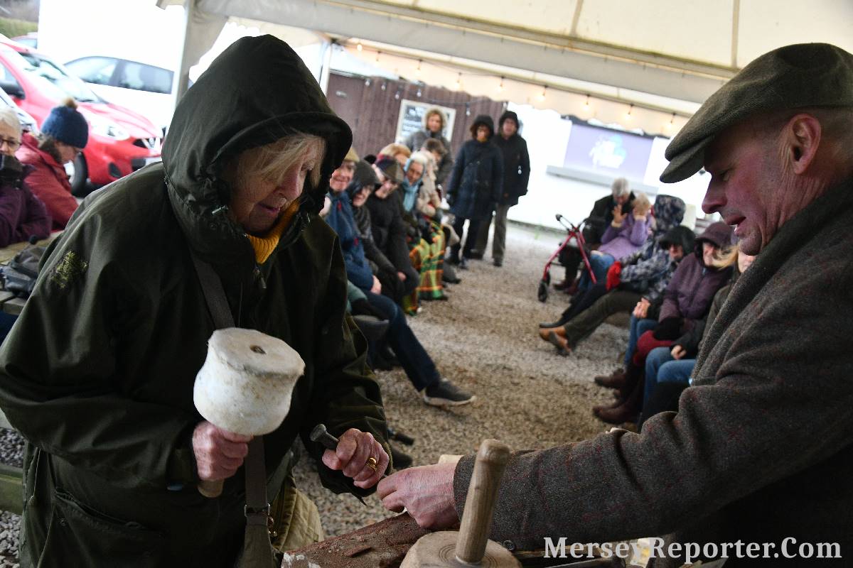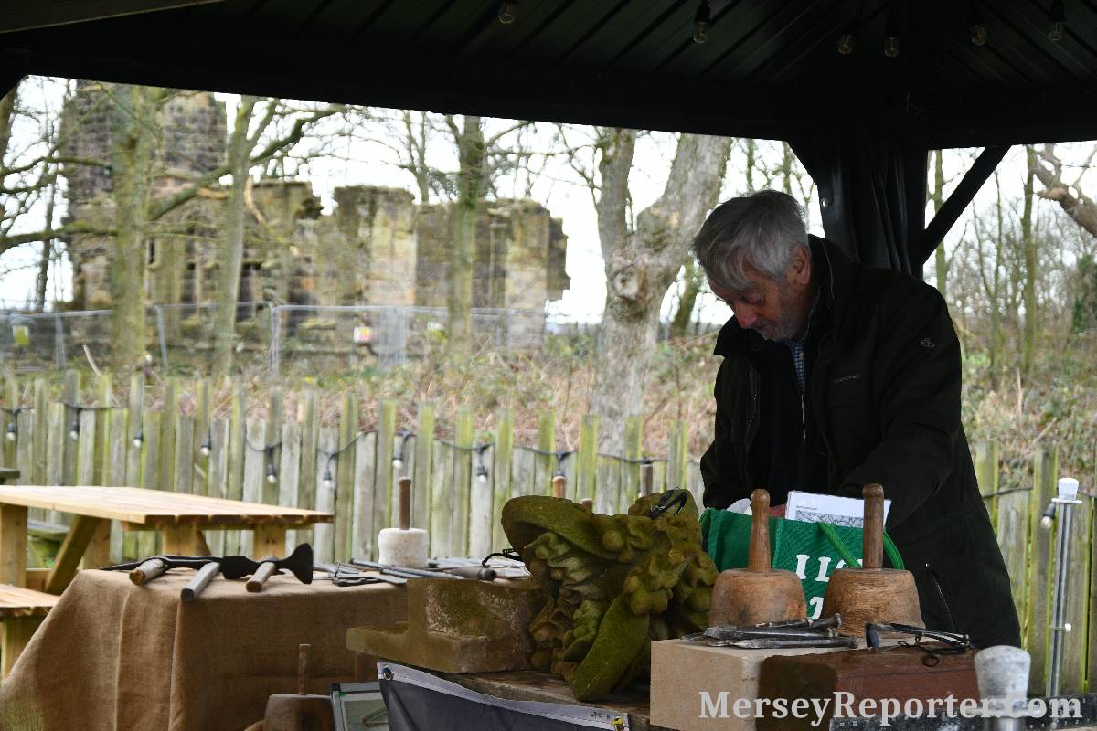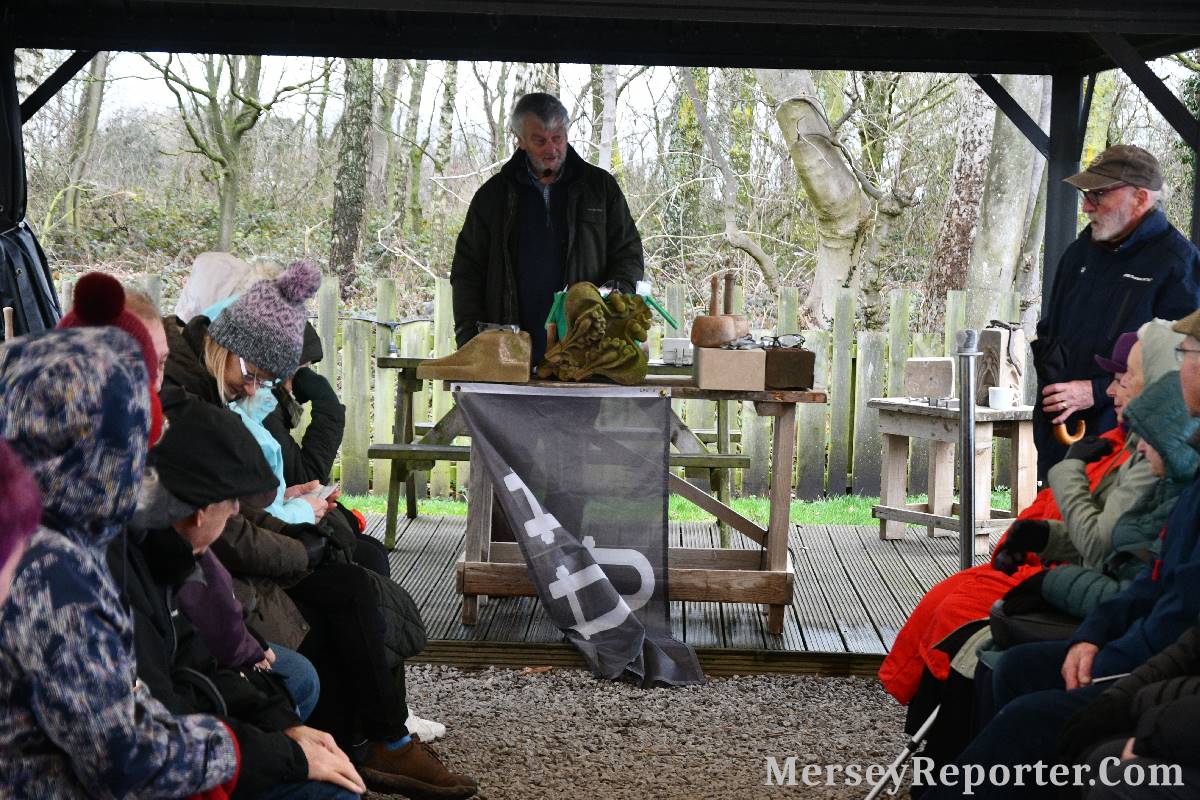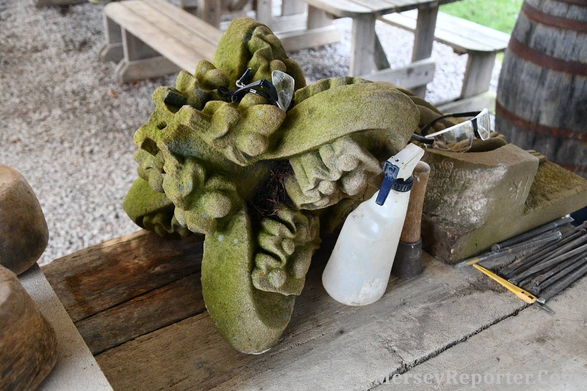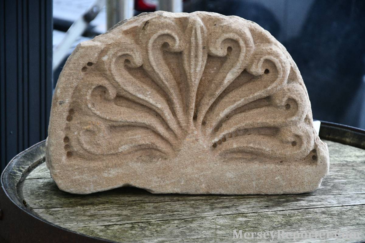 Under the awning provided by the Scotch Piper, there were photos and literature, alongside artefacts, but the foul weather deterred much perusal. After the information was delivered the group was privileged to hear a talk given by an Ex Mayor of Magull, Ken Hughes, who is a qualified and very experienced stonemason, who has worked on many historical buildings, including:- Fountain's Abbey, and Liverpool Cathedral. He talked animatedly about his apprenticeship and methods of learning his art. He also demonstrative his skills carving a sandstone block. His talk and demonstration were both informative and amusing. He even allowed attendees the chance to have a go at carving a block of stone, which only highlighted just how much skill is required to make any impact! It must be inspiring to realise that the work you have completed and bears your mark (every stone mason has his own individual mark) will probably survive for hundreds, maybe thousands of years.