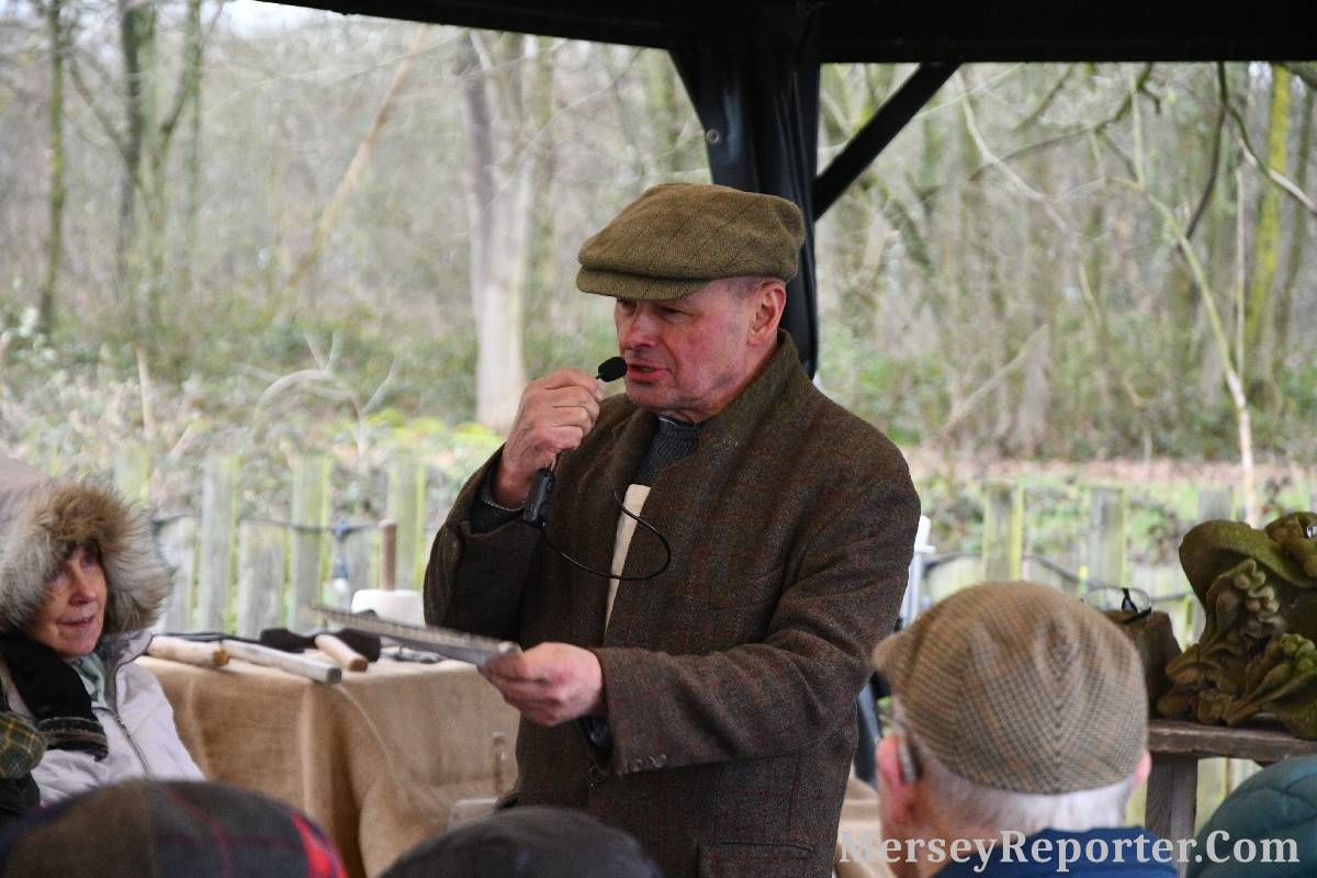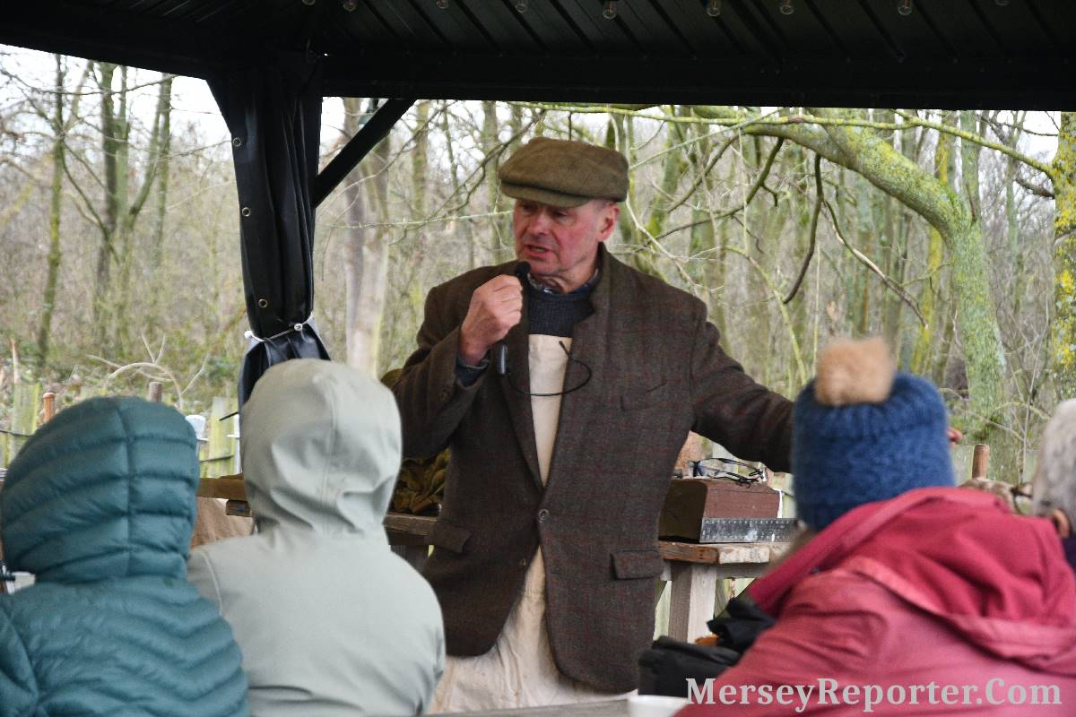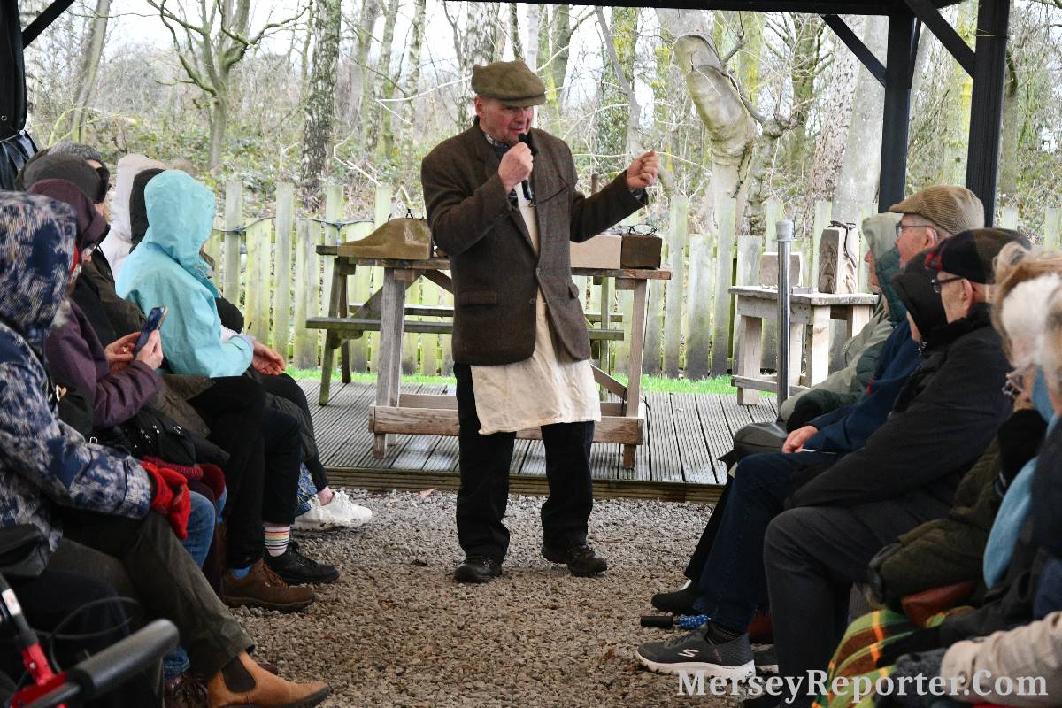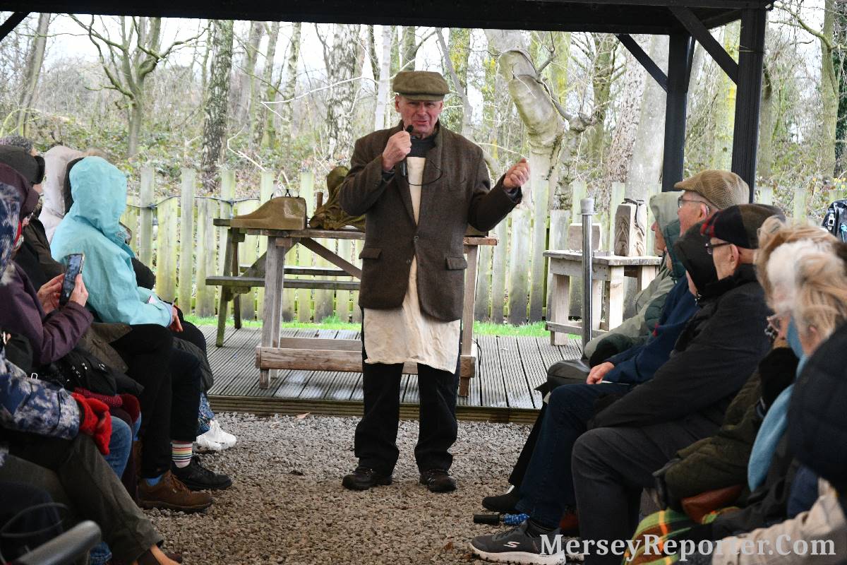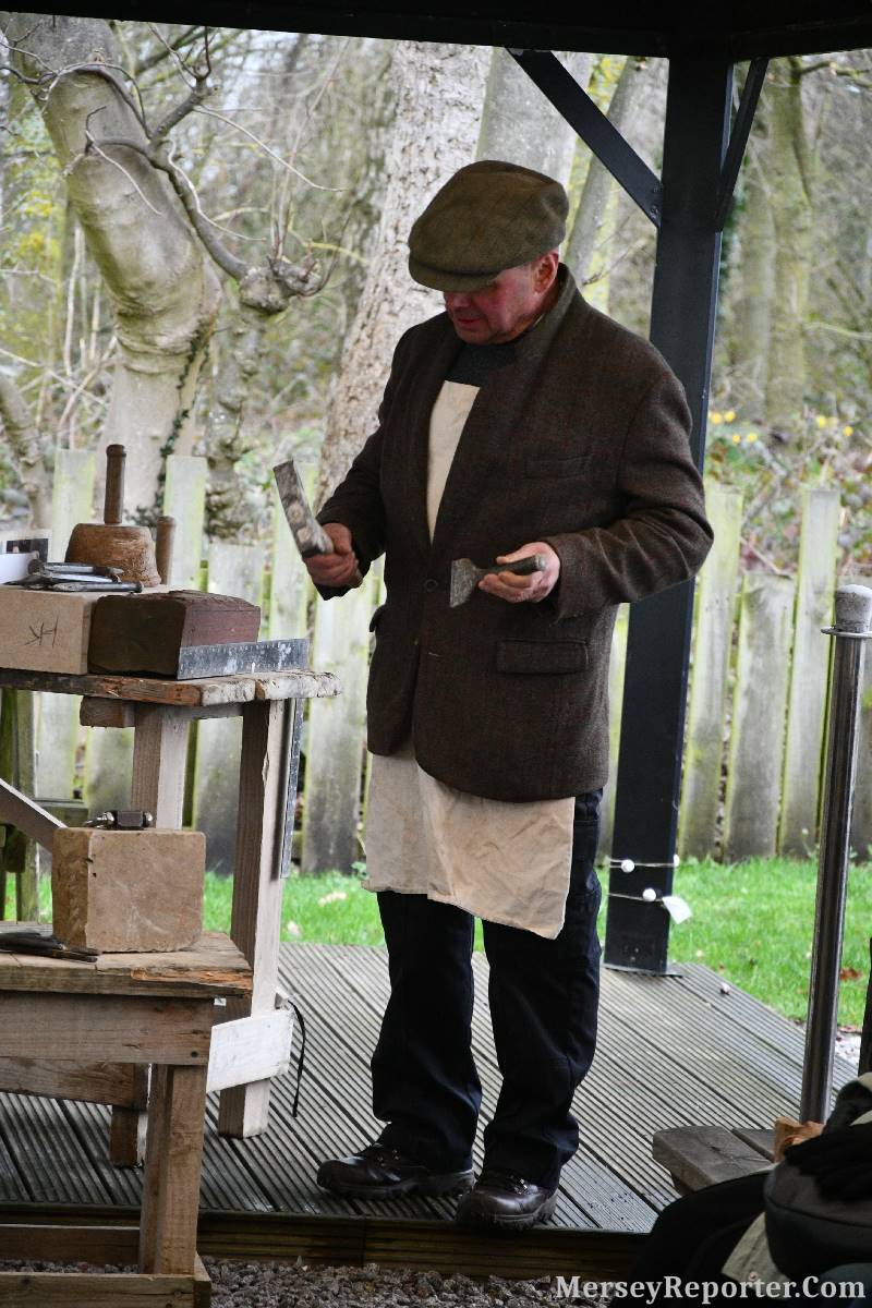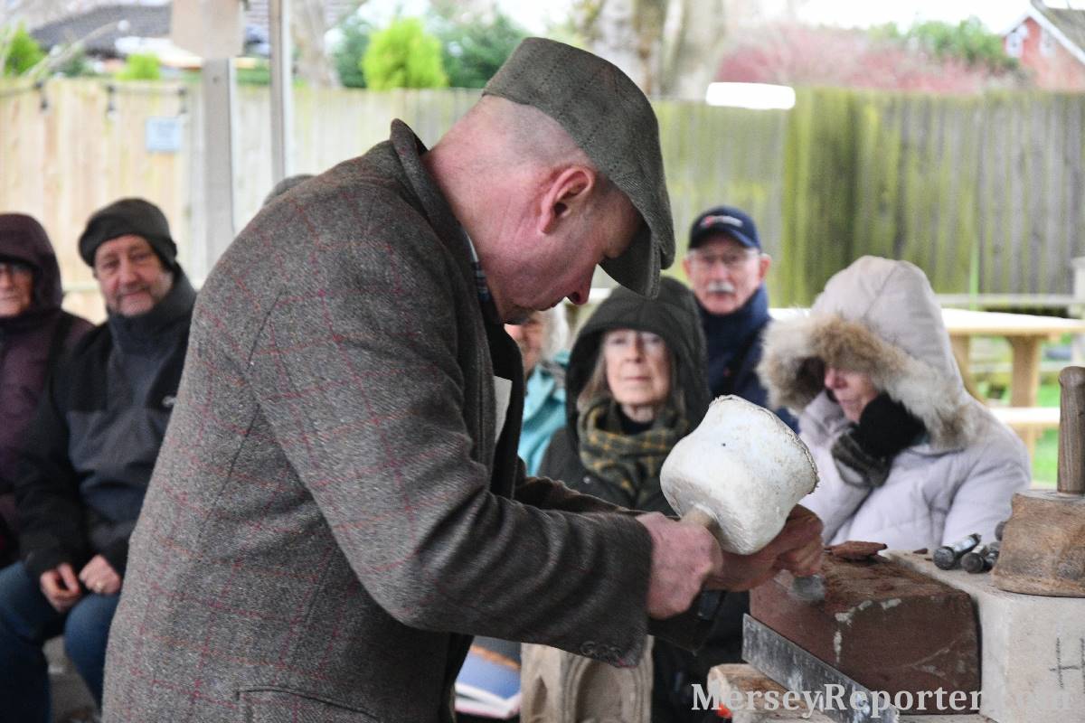 Under the awning provided by the Scotch Piper, there were photos and literature, alongside artefacts, but the foul weather deterred much perusal. After the information was delivered the group was privileged to hear a talk given by an Ex Mayor of Magull, Ken Hughes, who is a qualified and very experienced stonemason, who has worked on many historical buildings, including:- Fountain's Abbey, and Liverpool Cathedral. He talked animatedly about his apprenticeship and methods of learning his art. He also demonstrative his skills carving a sandstone block. His talk and demonstration were both informative and amusing. He even allowed attendees the chance to have a go at carving a block of stone, which only highlighted just how much skill is required to make any impact! It must be inspiring to realise that the work you have completed and bears your mark (every stone mason has his own individual mark) will probably survive for hundreds, maybe thousands of years.